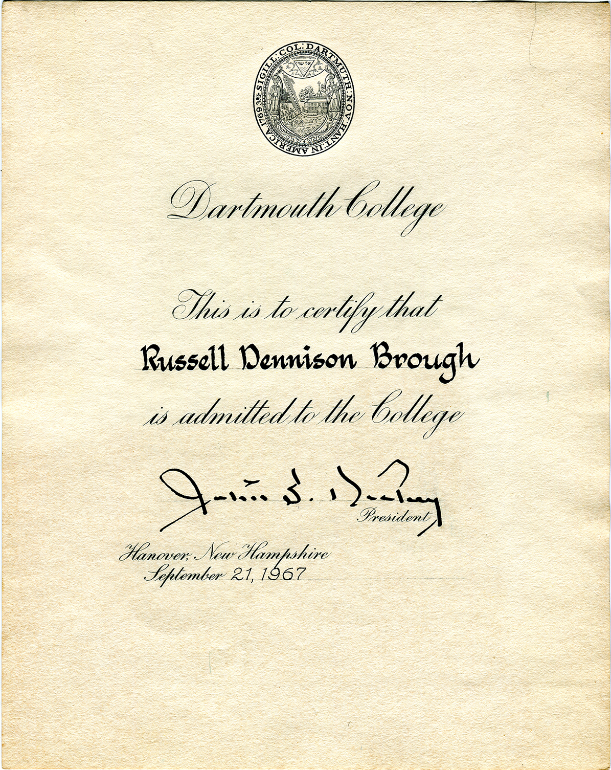 Russ’s Dartmouth Matriculation Certificate withJohn Sloan Dickey’s signature